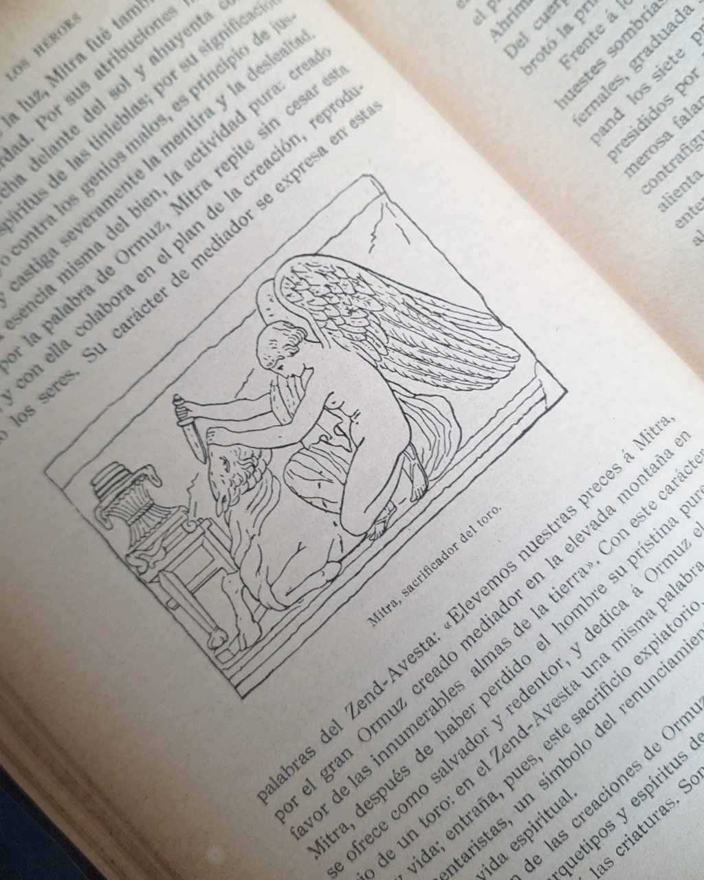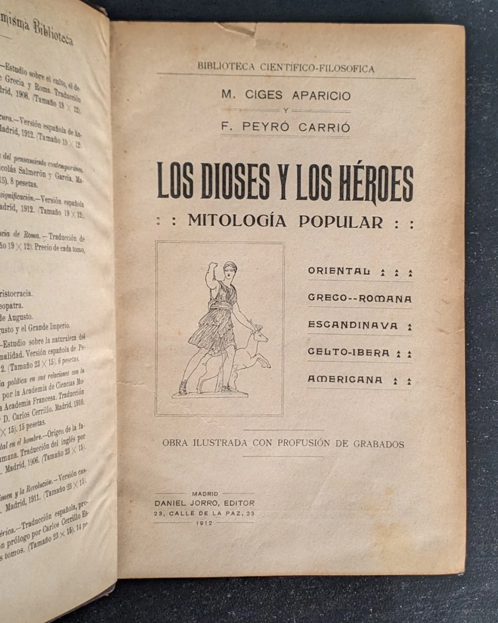 Este ejemplar de “Los dioses y los héroes: Mitología Popular”, de Ciges y Peyró, es uno de esos tomos que uno siente que está rescatando del tiempo más que comprando. La tapa en pasta española, con vetas que parecen casi orgánicas, le da ese aspecto de objeto encontrado en una biblioteca antigua.