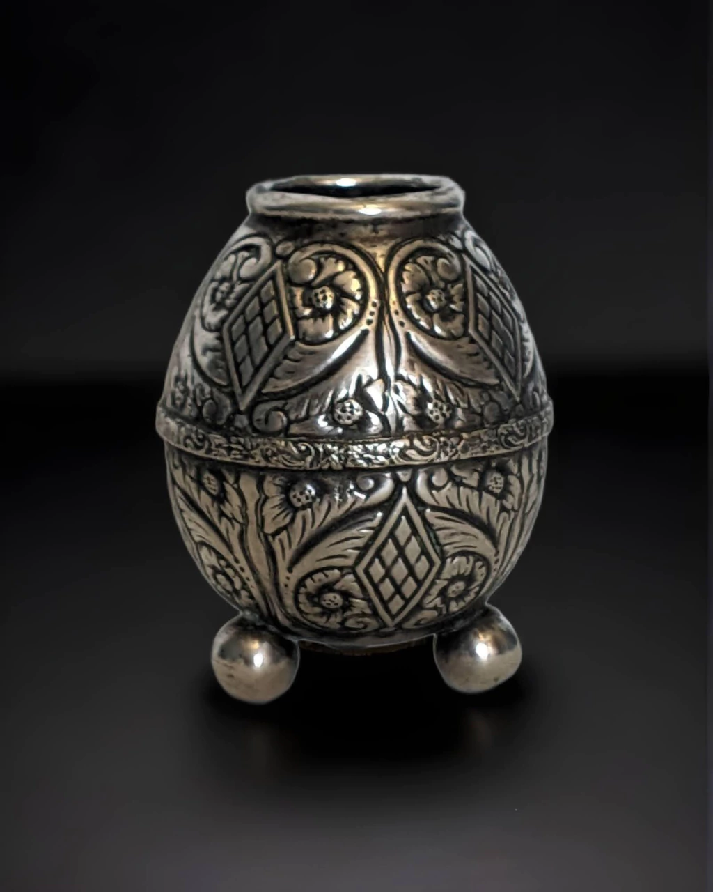 Este mate antiguo de alpaca cincelado a mano no es solo un objeto para compartir la tradición, sino también una pieza de colección que lleva grabada la paciencia y el detalle del trabajo artesanal.