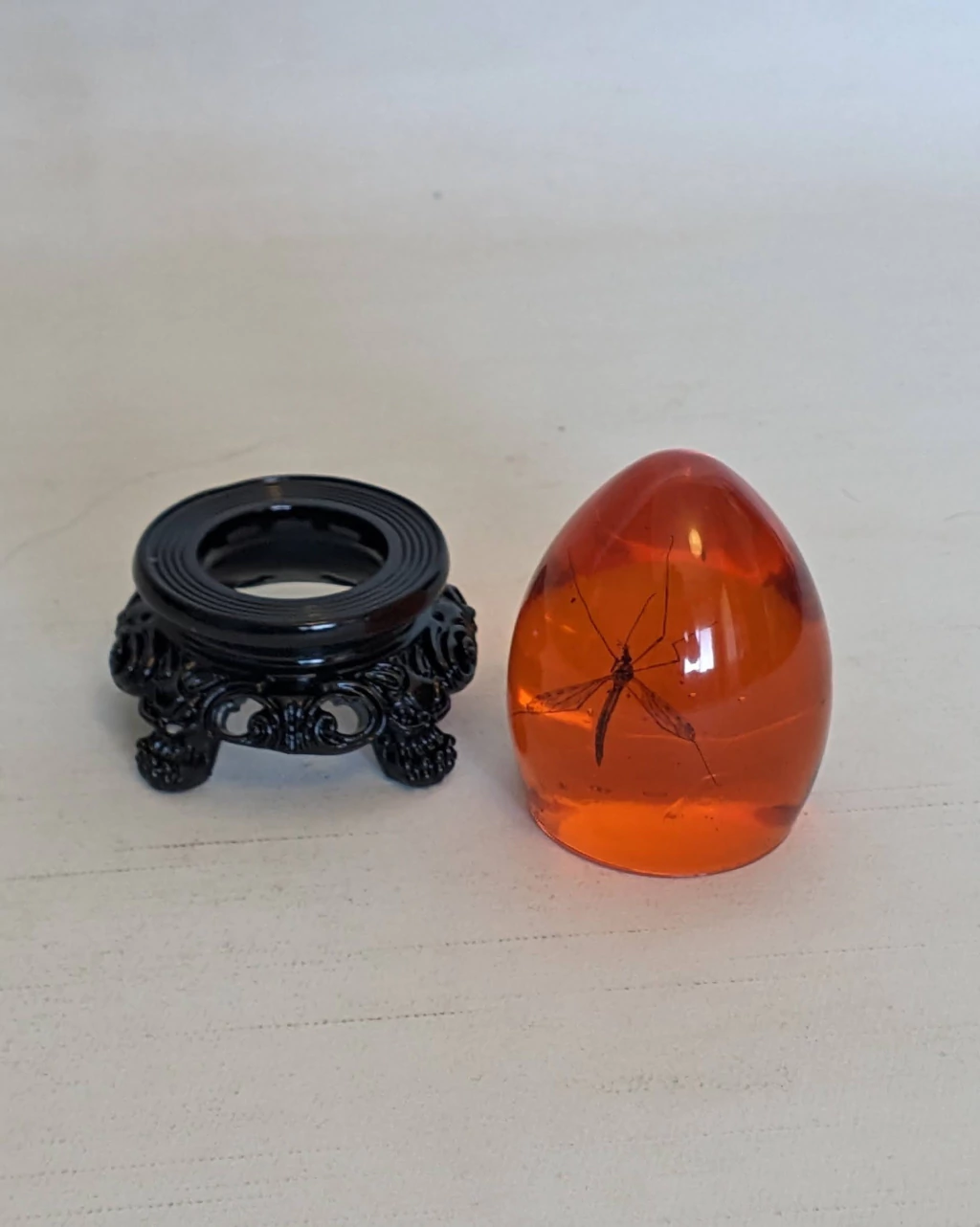 El insecto es una Típula en resina imitación ámbar. Tipula es un extenso género de insectos de la familia Tipulidae.